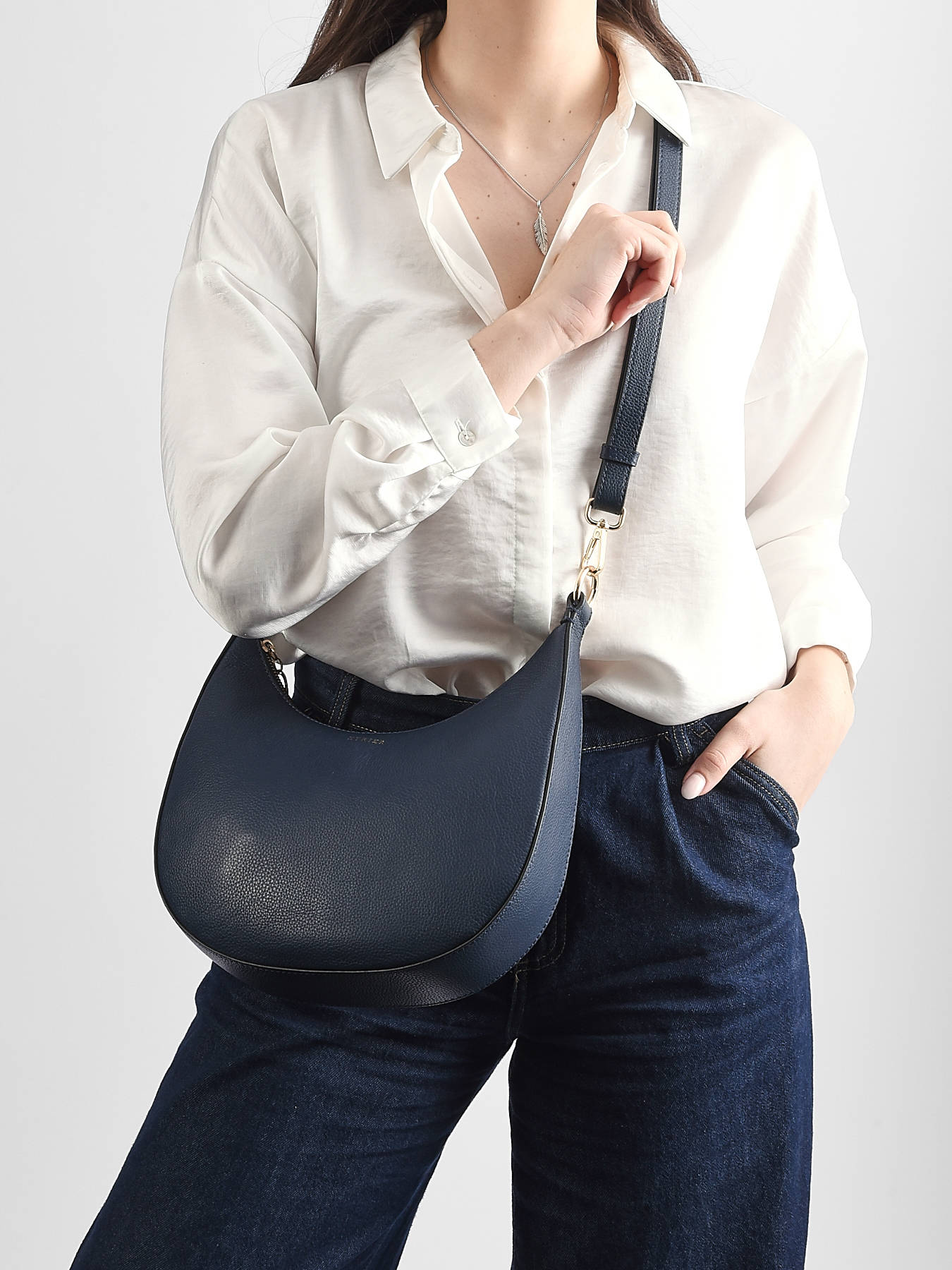 Cette nouvelle forme, de la ligne emblématique TRADITION par ETRIER, séduit par son design en demi-lune, offrant un espace de rangement généreux tout en conservant une allure élégante et moderne. Parfait pour les femmes actives, ce sac conjugue fonctionnalité et raffinement. Les bijoux dorés et l’étrier sur le zip évoquent les codes distinctifs de la collection TRADITION, ajoutant une touche sophistiquée à ce modèle intemporel. À l’intérieur, vous profiterez d’une poche simple et d’une poche zippée pour organiser vos essentiels, tandis que le format moyen vous permet de transporter facilement vos indispensables du quotidien. Avec sa bandoulière amovible et réglable, ce sac s’adapte à toutes vos envies : porté à l’épaule pour un look décontracté ou en travers pour une allure plus pratique. Sa conception soignée et son design minimaliste en font un choix incontournable pour celles qui recherchent un sac élégant et spacieux, sans compromettre le style. Le sac bandoulière demi-lune TRADITION par ETRIER, un accessoire pensé pour vous accompagner avec élégance au quotidien.